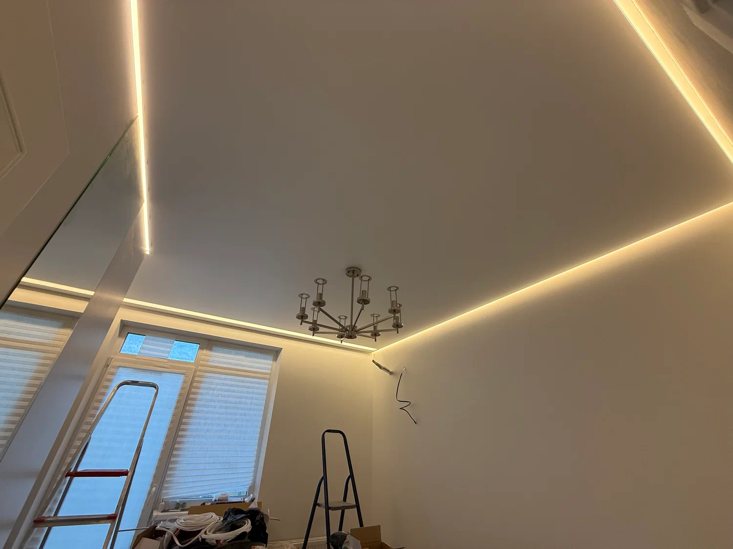 Быстрый монтаж натяжных потолков любого типа с установкой освещения и чистым завершением работ.